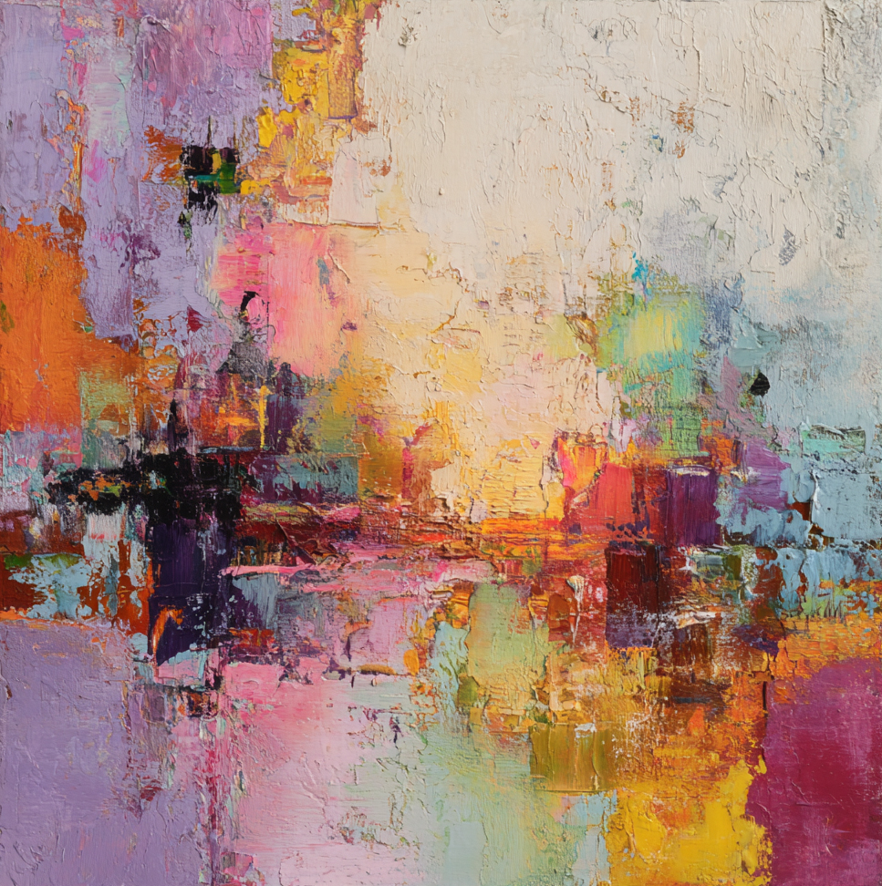 This expressive abstract artwork bursts with vibrant hues and textured layers, blending warm oranges, deep purples, and radiant yellows with soft pastels. The bold brushstrokes and rich surface create a sense of movement and depth, turning color into pure emotion. Perfect for contemporary living rooms, offices, or creative spaces, this high-quality print adds sophistication, energy, and artistic flair to any interior.